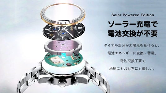 ソーラー充電で電池交換が不要。ダイアル部分が室内灯や太陽光を受けて、電池エネルギーに変換・蓄電。電池交換不要で、地球にもお財布にも優しい。