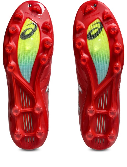 靴底は、中部をN字型に成型することで剛性を高め、接地時のブレの原因となる過度なねじれを抑制しています。プレーヤーのダッシュ動作を分析し、前モデルよりも高い推進力を得られるよう、つま先先端部分のスタッド配置角度を見直しました。また、つま先から2列目のスタッド形状をブレード形状に近づけ、縦方向へのグリップ力を高めることで、蹴り出し時のパワーを最後までピッチに伝えることができるようにしています。