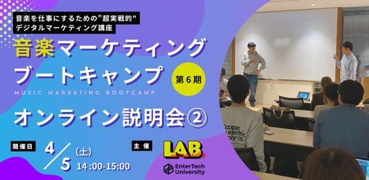 音楽業界が創った、音楽業界の就職・キャリアに1番近いオンラインスクール「エンターテック・ユニバーシティ」を運営するエンターテックエデュケーション株式会社(本社:東京都渋谷区、代表取締役:山口 哲一)は、音楽マーケティングスタートアップの株式会社LAB(本社:兵庫県神戸市、代表:脇田 敬)と共同で、実戦型音楽マーケター育成プログラム「音楽マーケティングブートキャンプ 第6期 ~音楽を仕事にするための"超実戦的"デジタルマーケティング講座~」を2025年4月より開講いたします。ただいま受講生を募集中です。