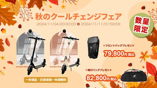秋の涼しさが心地よい季節になりましたね。この秋、楽天『Show !t』ではクールチェンジフェアを開催中!特定小型電動キックボードを、秋の特別価格で手に入れるチャンスです。初心者にもぴったりなブランドから、今ならフロントバッグが無料で付属し、さらに輪行バッグもお得な価格で購入可能です。期間中は1年間の任意保険無料キャンペーンも継続中!スペシャルセットもご用意していますので、ぜひこの機会にお得なセットをご活用ください。