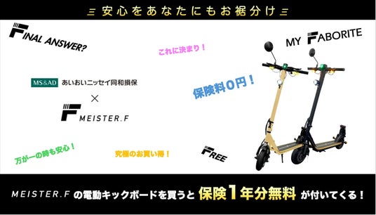 楽天市場「Show !t」では、あいおいニッセイ同和損保と提携し、1年間の無料傷害保険が付いた「MEISTER.F」の電動キックボードを販売中です。保安部品やアフターサポートの充実、1年保証もあり、安心して購入・利用できます。