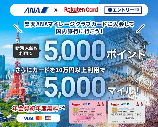 楽天カード、初のマイルを進呈するキャンペーン「条件達成で楽天ポイントと5,000マイルがもらえる!楽天ANAマイレージクラブカード入会キャンペーン」を開催