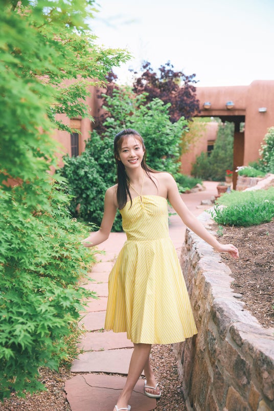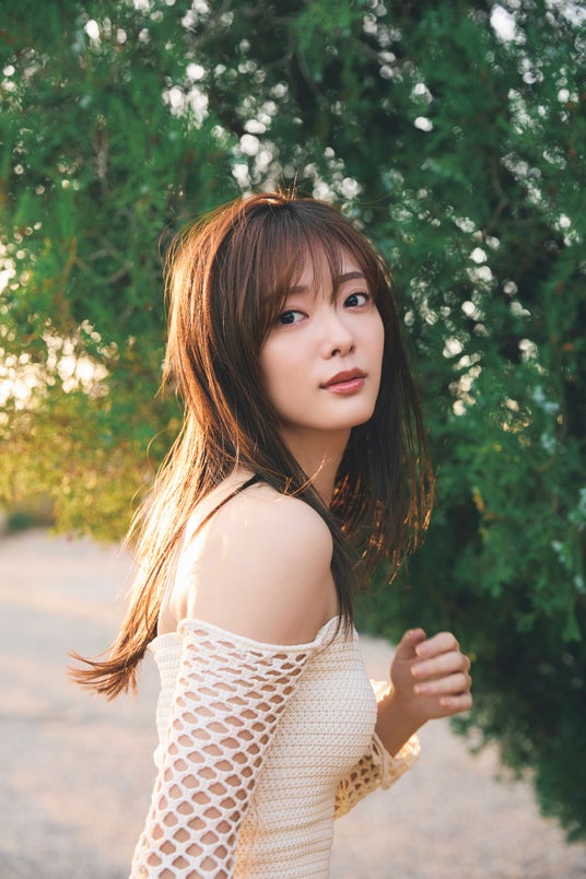 田村保乃の“素”の瞬間を捉えたカットは、撮影地・サンタフェ到着直後の夕焼けの下で撮影したもの。ふと振り返る眼差しの、力の抜けた表情が印象的な一枚です。一方、表紙はレースと花模様のドレスをまとった、夢見るような美しい表情。この対比は必見です。