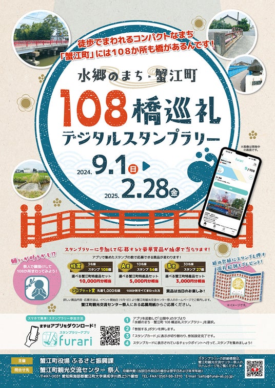 「蟹江町内には『108』という数の橋がある」ことから、橋をコンテンツとした新しい周遊イベントを企画、デジタルスタンプラリー橋巡礼版を令和6年9月1日からスタートさせます。