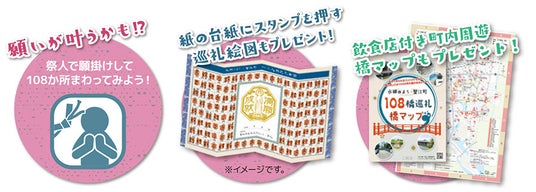 27か所、54か所、108か所まわるごとに町内特産品が抽選で当たる特典、全部まわったらコンプリート賞もご用意しています。