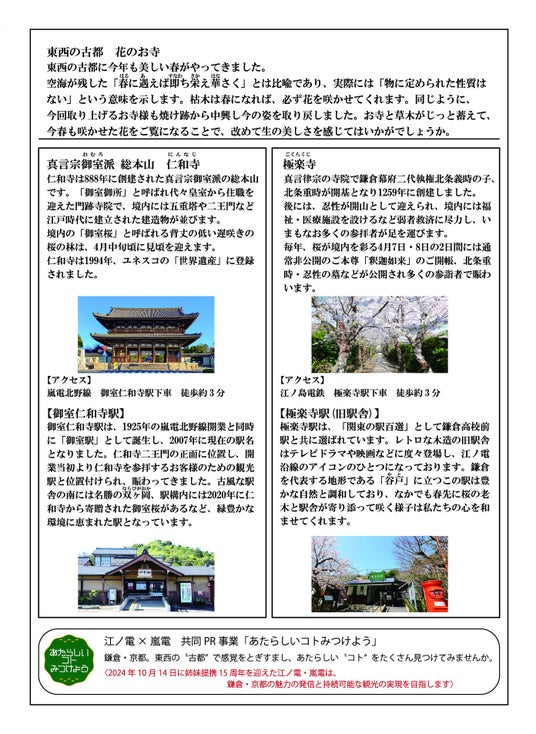 本シリーズ第4回として、古都の花のお寺とその最寄り駅の風景を紹介する「春に遇えば即ち栄え華さく ~京都 御室仁和寺、鎌倉 極楽寺」が完成、共同PRを実施します。