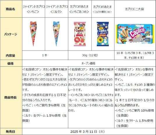 ジャイアントカプリコ<いちご>、ジャイアントカプリコ<ミルク>、カプリコのあたま<いちごあつめ>、カプリコのあたま<ミルクの星あつめ>、カプリコミニ大袋