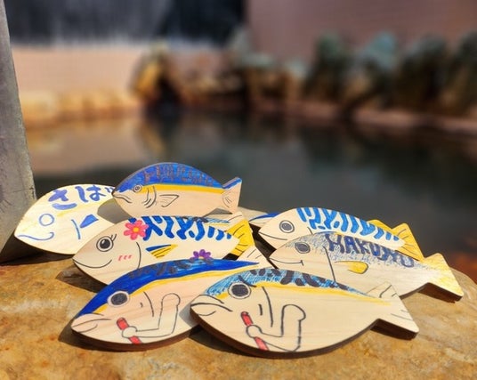 サバの形をしたヒノキを露天風呂に投入。白寿の湯の源泉は海水ほどの塩分濃度。そんな温泉にヒノキのサバたちが浮かびます。