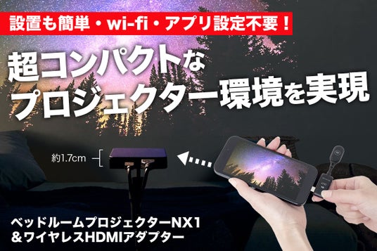 ベッドルームプロジェクター NX1(以下NX1)を中心に、ワイヤレスで投影可能なHDMIワイヤレスアダプターや、NX1専用ワイドアングルレンズなどを最大半額で販売致します。