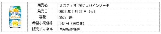 「ミスティオ 冷やしパインソーダ」は、昨年販売した「冷やしパインソーダ」をリニューアル!甘い香りあふれるパインのトロピカルな味わいと、口の中でぎゅっと感じる甘酸っぱさが心地よい、夏を感じる爽快なパインソーダです。