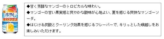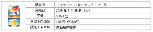 新商品の「ミスティオ 冷やしマンゴーソーダ」は、甘く芳醇なマンゴーのトロピカルな味わいで、マンゴーの甘い果実感と爽やかな酸味、キリっとした喉越しをお楽しみいただけます。