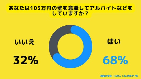 68%の大学生が103万円の壁を意識しながらアルバイトをしていると回答した。