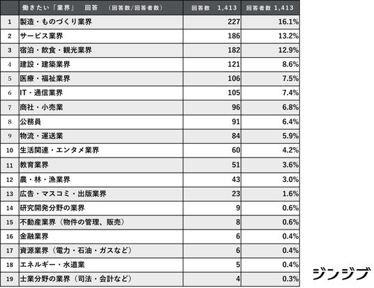 働きたい業界1位「製造・ものづくり業」、なりたい職業1位「接客職」
