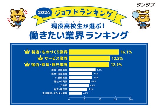 2024年の現役高校生が選ぶ「働きたい業界ランキング」の結果では、「製造・ものづくり業界(16.1%)」が最も多く回答を集めました。次いで2位は「サービス業界(13.2%)」、3位は「宿泊・飲食・観光業界(12.9%)」となり、接客や人と接する業界に人気が集まりました。続けて、「建設・建築業界(8.6%)」と「医療・福祉業界(7.5%)」と「IT・通信業界(7.4%)」がそれぞれ上位に入りました。(※2)