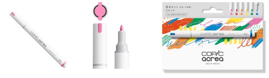 「コピック アクレア」は、水性顔料インクのカラーマーカーで、紙はもちろん金属、木、ガラス、プラスチックなど様々な素材に描くことができるマーカーです。