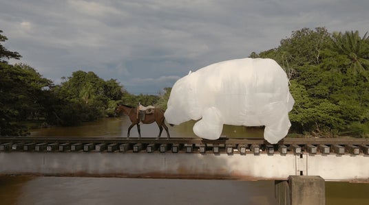 コロンビアのカルデロン&ピニェロス [Calderon & Piñeros] による「Hippos in Gravitas」は、カバの形を模した白い風船が地面から浮かび上がり、幽霊のようにマグダレナ川沿いを浮遊する様子を映します。1980年代に麻薬王パブロ・エスコバルによって持ち込まれたカバが生息域を広げ、今日に至るまでマグダレナ流域周辺の生態系に与える影響や、カバの社会的、法的、政治的に不安定な状況を、コロンビアの豊かな自然を背景に浮き彫りにします。
