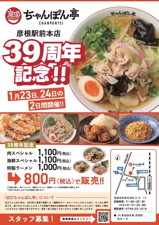 ドリームフーズ株式会社(本社:滋賀県彦根市、代表取締役:山本英柱)は、2025年に「近江ちゃんぽん亭 彦根駅前本店」が39周年を迎えることを記念し、1月23日(木)・24日(金)の2日間限定で周年祭を開催します。