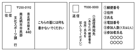 往復ハガキ1枚に1.郵便番号、2.住所、3.氏名、4.電話番号、5.参加人数(1人または2人)、6.参加者氏名、7.返信用宛先を明記のうえ、下記まで郵送してください。