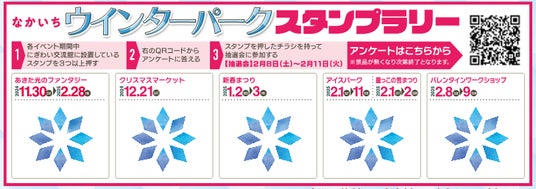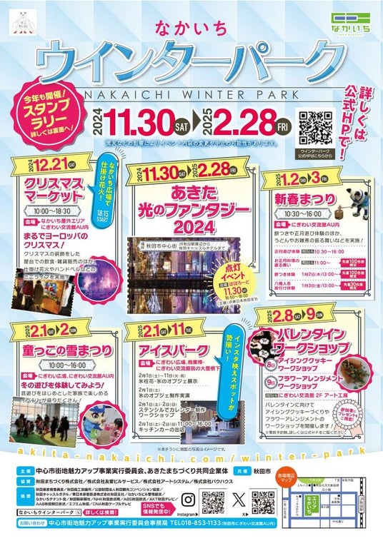 秋田の冬を彩る「なかいちウインターパーク」が今年も開催!鮮やかな光の演出が楽しめる「あきた光のファンタジー」のほか、クリスマスマやお正月、バレンタインなどにあわせた多彩なイベントが盛りだくさん!スタンプを集めてアンケートに回答するとバレンタインにちなんだ素敵な景品が当たるスタンプラリーも開催!