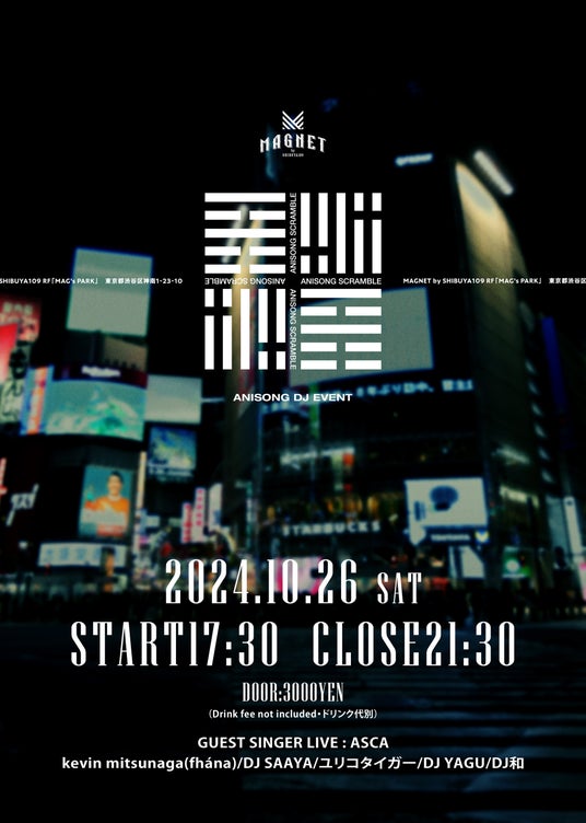 株式会社SHIBUYA109エンタテイメント(本社:東京都渋谷区、代表取締役社長:石川あゆみ)は、東京・渋谷で運営する「MAGNET by SHIBUYA109」の屋上イベントスペース「MAG’s PARK」にて、アニソンDJイベント『Anisong Scramble(アニソン スクランブル)』を9月に始動、第2弾を2024年10月26日(土)に開催いたします。
