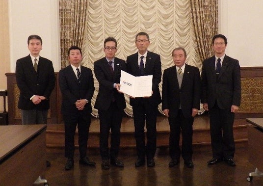 (左から)関根章理事・フィギュア部長(日本スケート連盟)、加藤光国課長補佐(スポーツ庁)、岩田史昭常務理事兼事務局長(JSPO)、大久保雅直副知事(山梨県)、高野剛会長(山梨県スポーツ協会)、降籏友宏教育長(山梨県教育委員会)