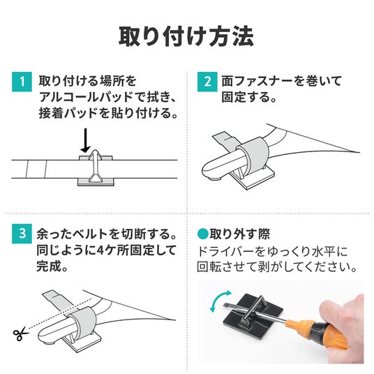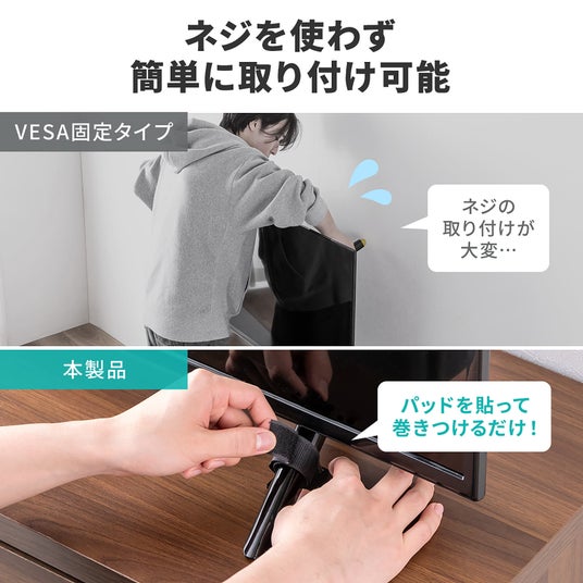 テレビ台の4隅に接着材付きフックを貼り付け、連結されたベルトをテレビ脚に巻いて、面ファスナーで固定するだけで設置が可能です。テレビを持ち上げたり、移動させたり、背面に回り込む手間もありません。取り外す際もマイナスドライバー1本で、スムーズに取り外しが可能です。
