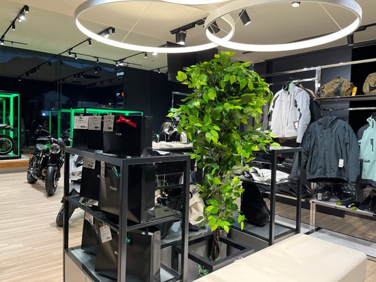 木目調のフロアと白い天井が織りなす明るい店内。モーターサイクルとプラザアパレルがゆったりと展示され、どなたでも楽しめる空間となっています。