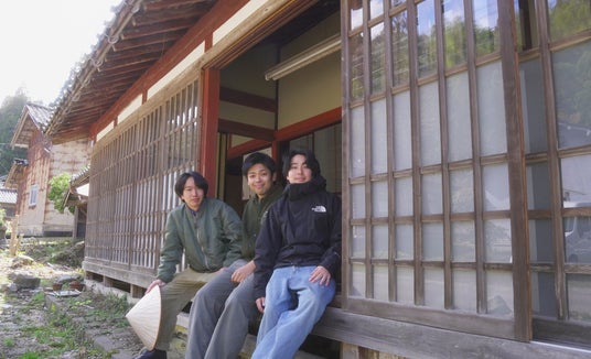 築158年の古民家で、地元の温かさを感じられる宿泊施設として再生を目指す『能登創生のらり』のメンバー(右:宮澤和喜 中央:岡田渉 左:比留間希星)