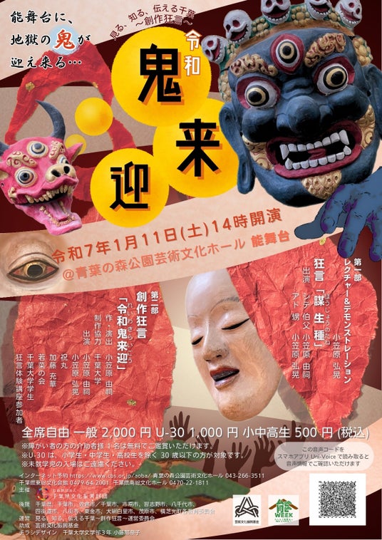 令和7年1月11日(土)に青葉の森公園芸術文化ホールにて、創作狂言「令和鬼来迎(れいわ きらいごう)」を上演します。この創作狂言は、千葉にまつわる物語や伝承を狂言にして、伝統を繋いでいく「見る、知る、伝える千葉~創作狂言~」プロジェクトとして、狂言師と千葉大生、県民らがともに創り上げ、平成17年より毎年公演を行ってきました。