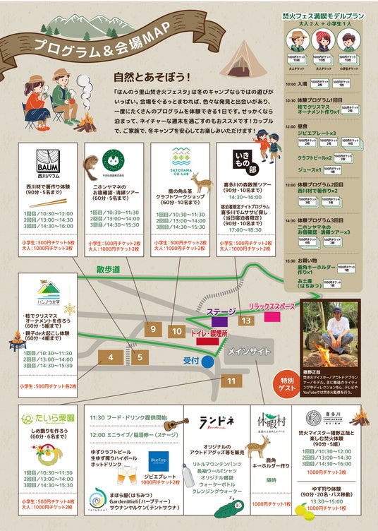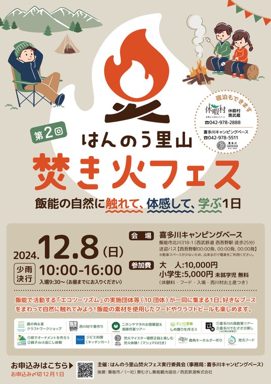 今回のイベントは、ホスピタリティの充実と地元事業者とのコラボレーションに力を注ぎ続けている「喜多川キャンピングベース」(住所:埼玉県飯能市北川318-1、支配人:合田忠功)が、飯能市エコツーリズム(自然・文化・人のつながりによって発展する活力のある地域を目指し、エコツアーを企画・実施)に参加する地元事業者8団体とともに構成された「はんのう里山焚き火フェス実行委員会」の事務局をつとめ開催する運びとなりました。
