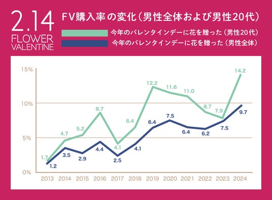 その結果、2024年度の調査では、活動開始当初と比べて「フラワーバレンタイン」における男性の花購入率が過去最高の9.7%に達しました。特に20代男性の購入率が際立っており、“7人に1人”に相当する14.2%がバレンタインデーに花を贈っており、若年層の花購入の動きが活発になっています。