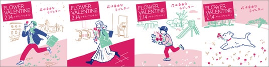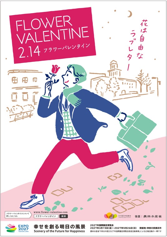フラワーバレンタインのビジュアルは、花を片手に相手の喜ぶ笑顔を想像しながら弾むような足取りで歩く様子をイラスト化、花を贈る際のウキウキワクワクする気持ちを表しました。