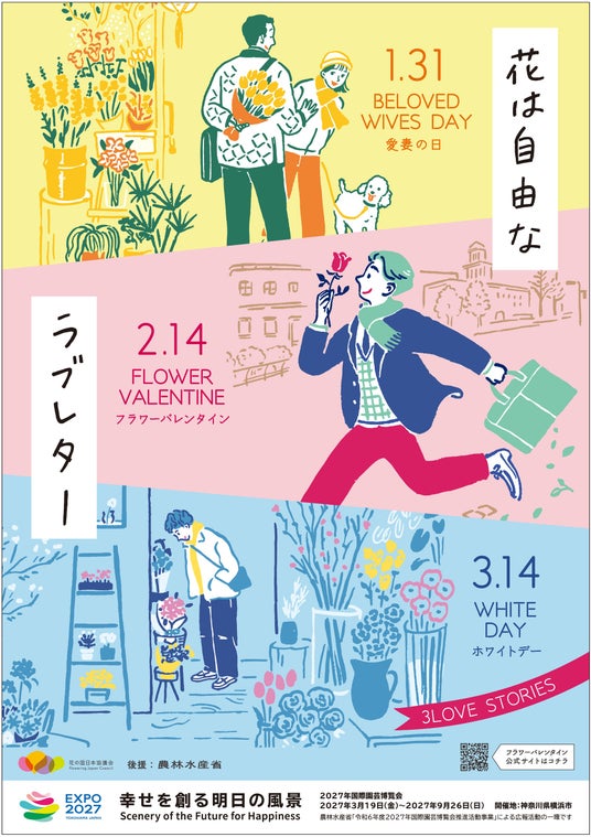「フラワーバレンタイン」とは、こうしたバレンタインデーの素敵な風習にならい、大切な人に愛や感謝の気持ちをこめて花を贈るきっかけを作り、花贈りを応援するプロモーションです。さらに、バレンタインデー前後の1月31日「愛妻の日」、3月14日「ホワイトデー」を含め「3LOVE STORIES」と表現し、1月~3月には花贈りのチャンスが3回あることを全国の花店からお客様へアピールしています。