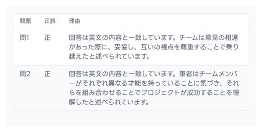 質問回答が英語だと、なんとなくキーワードだけ拾って推測回答する可能性がありますが、日本語で答えさせることで「しっかり理解していなければ回答不可」の状態を確立します。