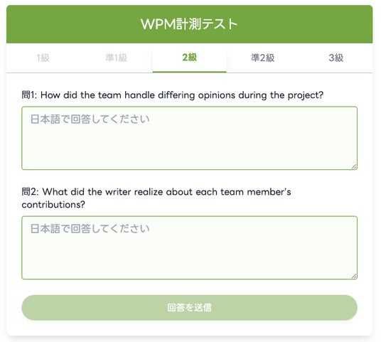 英文は英検(R)2級レベルの単語・文法・話題をカバー。高校英語以上の読解力が必要となりますが、読み飛ばしをしてもあとで正答できなければWPMは算出されないため、飛ばし読みは無意味です。