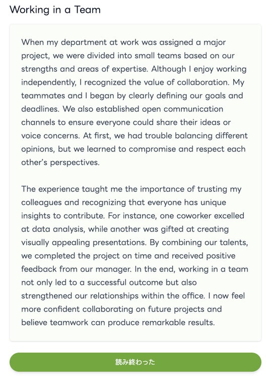 “ただ早く読んだ数値”ではなく正確な把握+スピードを組み合わせて測るため、練習すればするほど本番でのリーディング時間短縮に直結します。英検(R)2級の大問を素早く解いて、残り時間を見直しやライティングに充てられる可能性が高まります。