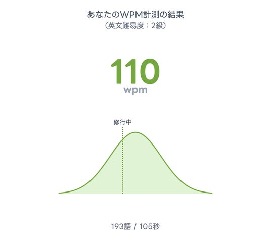 指定の問題2問に正答できた場合のみWPMが表示され、ランクが付与されます。たとえタイムが短くても、問題に間違えば数値は得られず、スピードと理解度の両立が必須となります。