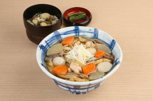 けんちんそば定食冬の野菜をたっぷり使用しました。ごま油の香りが食欲をそそります。