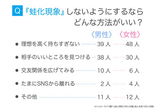 『蛙化現象』しないようにする方法では、男女ともに『理想を高く持ちすぎない』が多いことがわかりました。