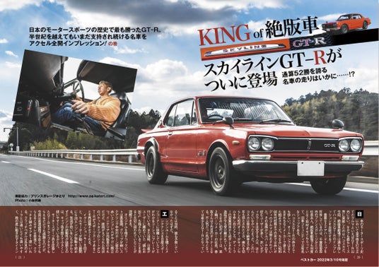 国産絶版モデルの王者ともいうべき初代スカイラインGT-R、通称ハコスカGT-Rも実際に試乗してインプレッション。アクセルを深く踏み込んだ際のエンジンの官能さは今なお健在なことに感動!