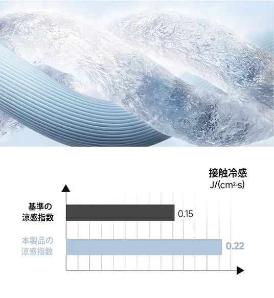 肌に触れたときの熱吸収率を計測する接触瞬間涼感性能で0.22の試験結果を獲得しました(0.2以上で接触冷感を感じると言われています)