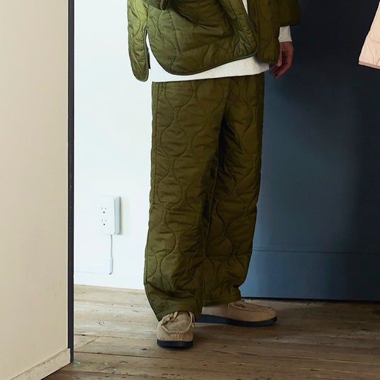 米軍M-65フィッシュテールパーカーのライナーを模したヒョウタン型キルティングを施した軽量なDAN-TENです。 今期はツヤを抑えた素材に変更し身頃、袖などのパーツをクレイジーパターンに組むことで新鮮なイメージに仕上げました。また、より羽織りやすく、綺麗なシルエットになるように各所のサイジングも変更しアップデートしています。 付属の袋に収納可能なパッカブル仕様で、収納時には枕にも。また、持ち運びや自宅での保管時に便利です。