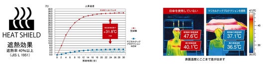 傘の製品遮熱性評価試験において 31.8℃の差が認められました。サーモグラフィ試験で頭頂部-10.5℃、顏表面-3.6℃温度差が認められました。