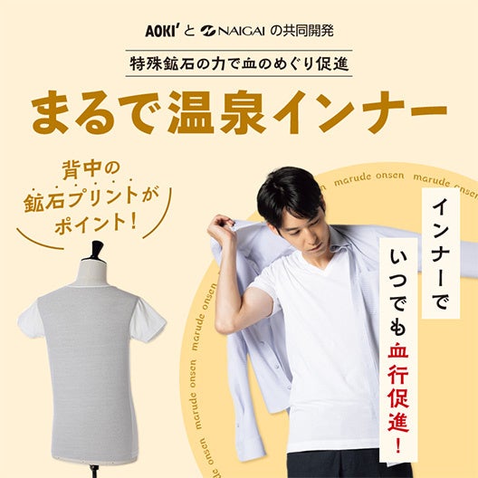 株式会社AOKI(代表取締役社長:森裕隆)は、プリントされた鉱石が放つ遠赤外線の力で血行を促進する効果が期待できる、株式会社ナイガイ(代表取締役社長:今泉賢治)との共同開発『まるで温泉』シリーズから、新たにメンズ肌着の販売を開始いたしました。
