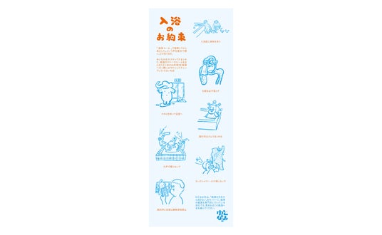 ・同封されている2つ折りの台紙の内側にはゆとなみ社のオリジナルイラストで「入浴のお約束」が描かれています。初めて銭湯に行く方でも安心して足を運んでいただけるよう願いを込めてお届けします。