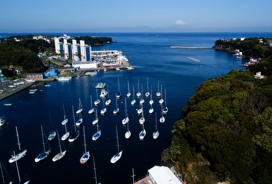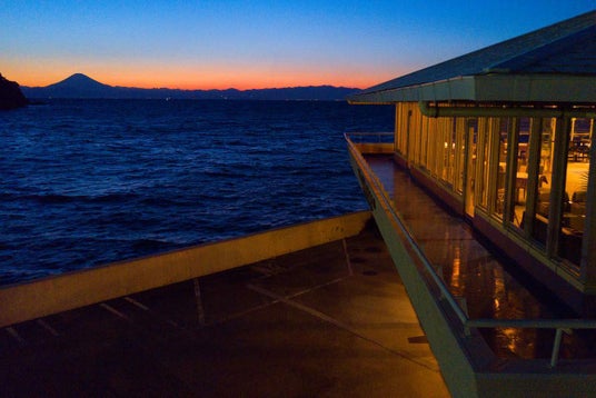 ヨットハーバー越しに富士山を眺める幻想的なサンセットタイム