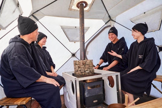 セルフロウリュ可能な海に浮かぶテントサウナは、環境に優しい「バイオフレア」(製造時にも廃棄物を出さないゼロエミッションのバイオマス燃料)を使用するフィンランド式サウナ。ストレスを軽減し健康を増進させるとされる「1/fのゆらぎ」をもつ波の揺れを感じながらじっくり温まり。身体の熱気そのままに海へダイブ。