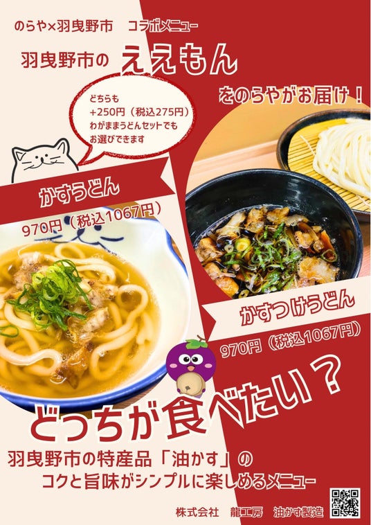猫のキャラクター「のらちゃん」でおなじみの人気うどんチェーン店"のらや"と羽曳野市がコラボし、市の特産品「油かす」を用いた新メニュー「かすうどん」「かすつけうどん」の2品が、令和7年3月14日(金)より、のらや羽曳野店限定で販売開始。のらやと羽曳野市の共同で、食を通じた地域の魅力発信を実施します!