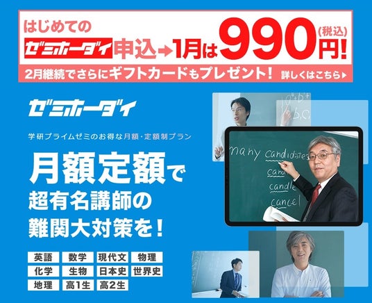株式会社 学研ホールディングス(東京・品川/代表取締役社長:宮原博昭)のグループ会社、株式会社Gakken(東京・品川/代表取締役社長:南條達也)は、2025年1月9日(木)より、難関大受験対策のオンライン映像授業「学研プライムゼミ」の月額・定額制受講プラン「ゼミホーダイ」において、はじめて受講をお申し込みされた方にお試し価格として1月の受講料を990円(税込)で提供する、「ゼミホーダイ初回990円キャンペーン」を実施中です。