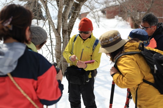 2.雪景色の苗場山麓ジオパークの説明を聞く苗場山麓ジオパークに認定されている津南町。地元のジオパークガイドが自然や歴史、雪国の知恵について語ります。